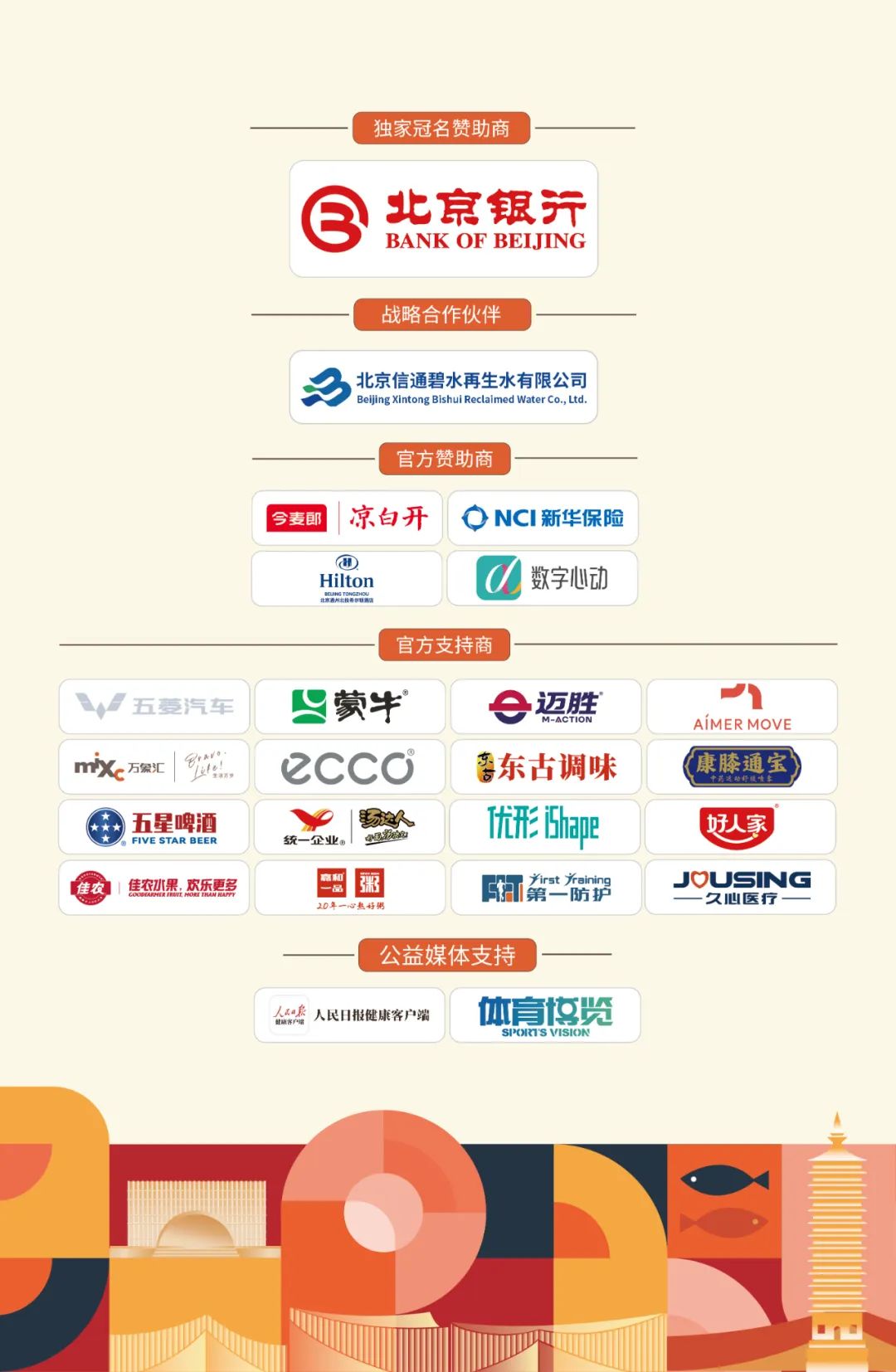 本届赛事得到了多家赞助商的大力支持。。。。独家冠名赞助商北京银行,,战略合作伙伴北京信通碧水再生水有限公司,,官方赞助商今麦郎凉白开、、、、新华保险、、、、北京通州北投希尔顿酒店、、、数字心动,,官方支持商五菱汽车、、、、蒙牛、、迈胜、、、AIMER MOVE 爱慕运动、、首开通州万象汇、、、ECCO、、、东古调味、、、、康膝通宝、、、五星啤酒、、、统一汤达人、、优形iShape、、、好人家、、佳农、、、、嘉和一品、、第一防护、、、、久心医疗,,公益合作伙伴中国红十字会总会事业发展中心,,,,公益媒体支持人民日报健康客户端、、、、体育博览均为赛事的成功举办提供了强有力的保障。。。。
